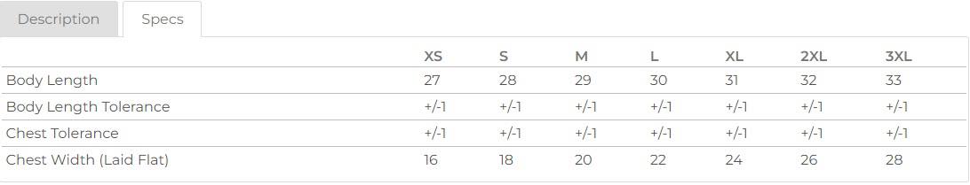 Optional T-Shirt Size Chart
